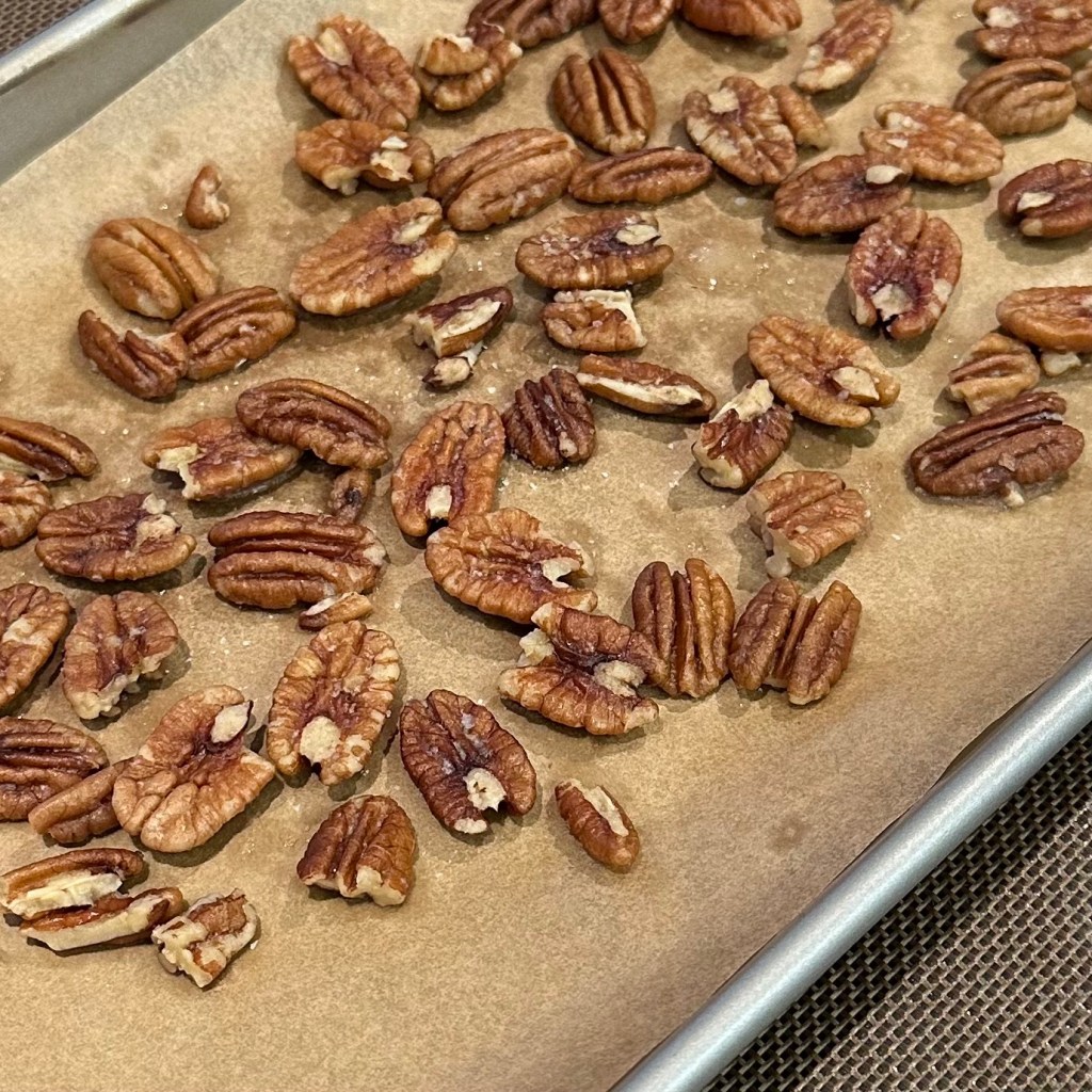 Last, and certainly not least, the salted pecans are easy, and something you can make well ahead of time, maybe enough to have some for when friends are over. For this effort, I tossed about a cup of pecan halves with a tablespoon of melted butter, added some salt, and tossed some more. Then put them in the oven at 250 deg for about 15 minutes. Let them cool, and then break them up a little before sprinkling on the caramel. Or, leave them whole and place in a decorative pattern.