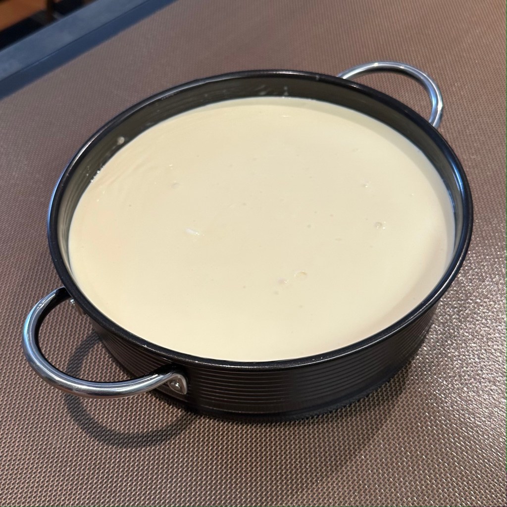 Once your batter is ready, pour it into the pan, then give the pan a jiggle or two, or three, to level the batter in the pan. Then it’s into a 300 deg. oven for 1-1/2 hours. Turn off the oven, prop the oven door with a wooden spoon, and let it rest in the oven for another hour.