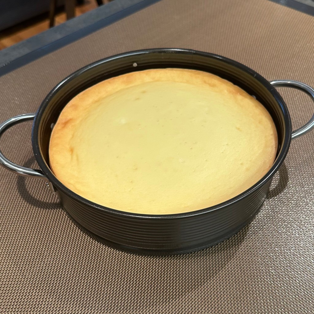 Once out of the oven, allow the cake to rest and cool for another hour or so before releasing the outside of the pan. I was lucky to have no cracks in the cake. I put a 8″ baking dish of very hot water on the bottom shelf of the oven when I first turned it on. It really helps, and is easier than a water bath.