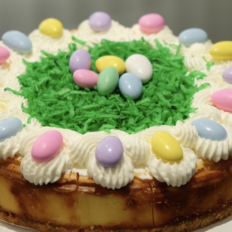I think I’ve read that the significance of eggs in the Christian celebration of Easter has to do with the idea of rebirth. A baked cheesecake is quite dependent on egg to get the result you want. This particular cheesecake was made using my basic cheesecake recipe with a ground almond crust, using almond extract rather than vanilla. It’s iced with whipped cream, and decorated with colored shredded coconut and Jordan almonds.