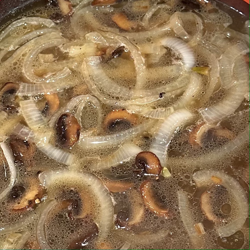 Once the oil and butter have heated, and the mushrooms are sizzling a bit, add the onions and sauté until the onions are soft and starting to brown. Add the cup of beef stock, a splash of white wine, then salt and pepper to taste. just before you’re ready to assemble, add some sour cream – a sprinkling of flour if you want it to thicken a bit more.
