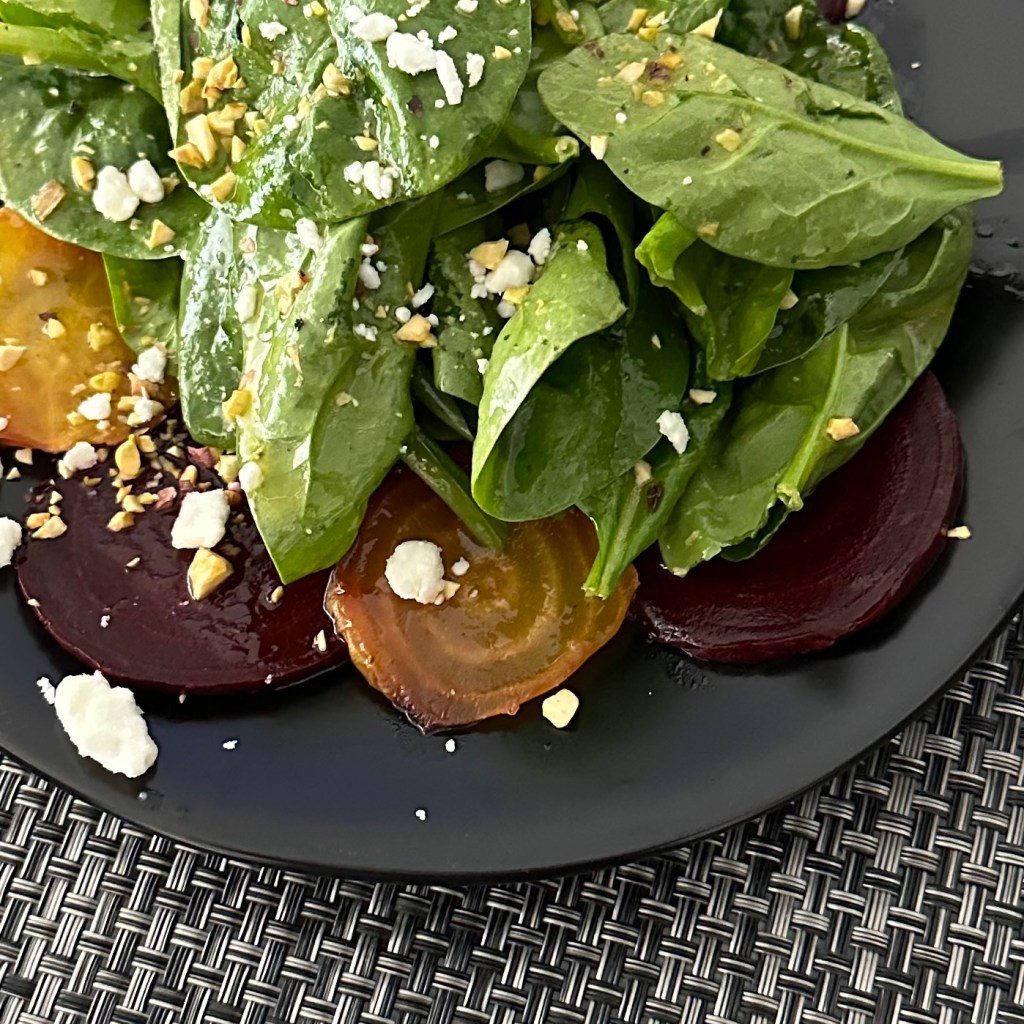 Salt and pepper to taste, add some chopped pistachios, and whisk. I plated the beets and drizzled some of the dressing on them. I tossed some spinach with a light sprinkling of the dressing (you don’t want it to wilt the spinach), and topped the beets with it. A final garnish of some chopped pistachios and some Feta (I just like the dryness of Feta), and you’re done. No fresh beets? Sliced pickled beets would work as well.