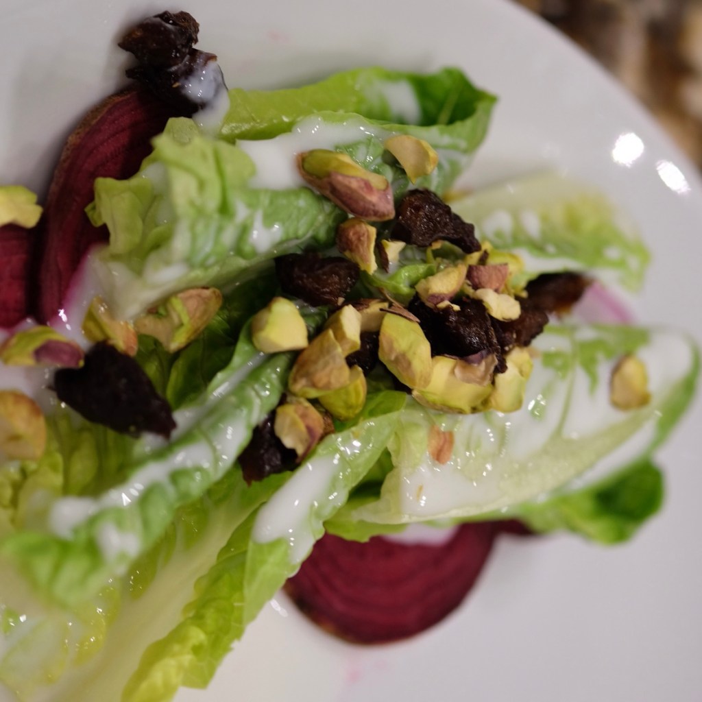 Not too long ago I was in DC doing touristy things, hoping to include in that visit a ‘return to yesteryear’ and have dinner with a friend at “Vidalia”. Alas, “Vidalia” was no longer, but the chef had opened “Honeysuckle” in its place. The menu featured a beet salad that, once replicated, I called “Honeysuckle Salad”, honoring it’s roots. This salad is built on a foundation of sliced, raw beets. Topping the beets is some butter lettuce, a simple dressing of buttermilk and lemon juice, a sprinkling of raisins, and some pistachios. Easy to assemble, and a colorful presentation. The original also had the surprise addition of a chocolate crumble – I would say you could use some crumbled Nabisco Chocolate Wafers, but those have been discontinued. Any rich chocolate cookie would do, and what it adds to the salad is a classic “don’t knock it ’til you’ve tried it”.