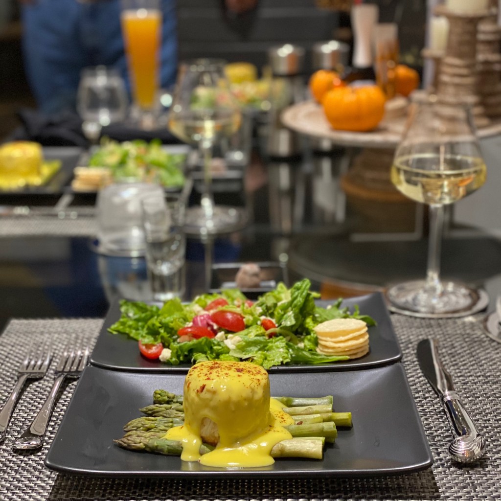 Crab cake with Hollandaise, plated atop steamed asparagus. Simple salad, rice crackers, like the ones you might have used as filler (gluten free all the way). And yes, a thinner crab cake, usually with more filler and fried a bit crispier, makes for a great crab cake Eggs Benedict.
