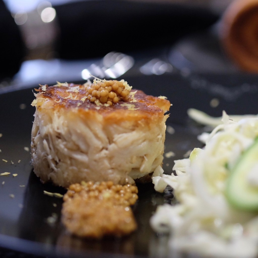 Crab cake with Feta slaw, garnished with pickled mustard seeds. The slightly sweet, acidic bite of the slaw is a perfect foil with the crab. The slaw? Shredded cabbage (slightly salted to sweat out some of the moisture), green onions (the green parts, thinly cut), citrus or champagne vinegar, salt, pepper, and Feta cheese. That’s it.