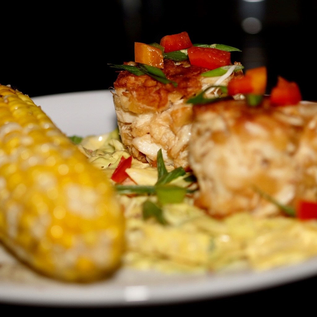 Crab cakes with a mustard slaw and roasted corn. The corn will remind some of a New England seafood boil; I just like roasted corn. Butter the ear of corn, season with salt, pepper, and some bell pepper, wrap in foil, and roast at 350 for about 30 minutes. The garnish is bell pepper and diagonally sliced green onion tops.