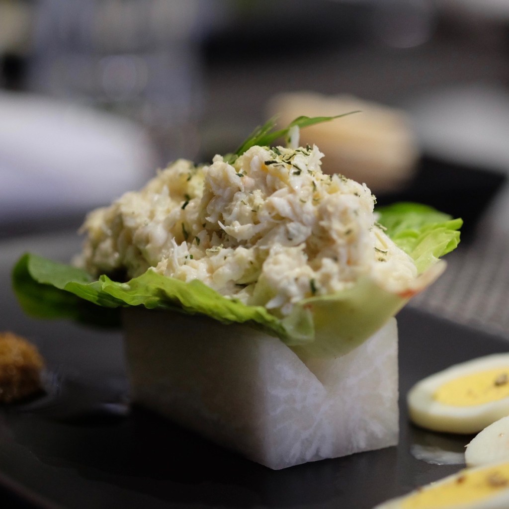 Baby gem or butter lettuce makes the perfect vessel for crab salad; both seem designed to hold just the right amount. For something a bit more special, you can mount crab salad on baby gem lettuce on a prepared and edible pedestal of Daikon radish. The radish gives some added crunch, and also a little heat. And what fun!!!