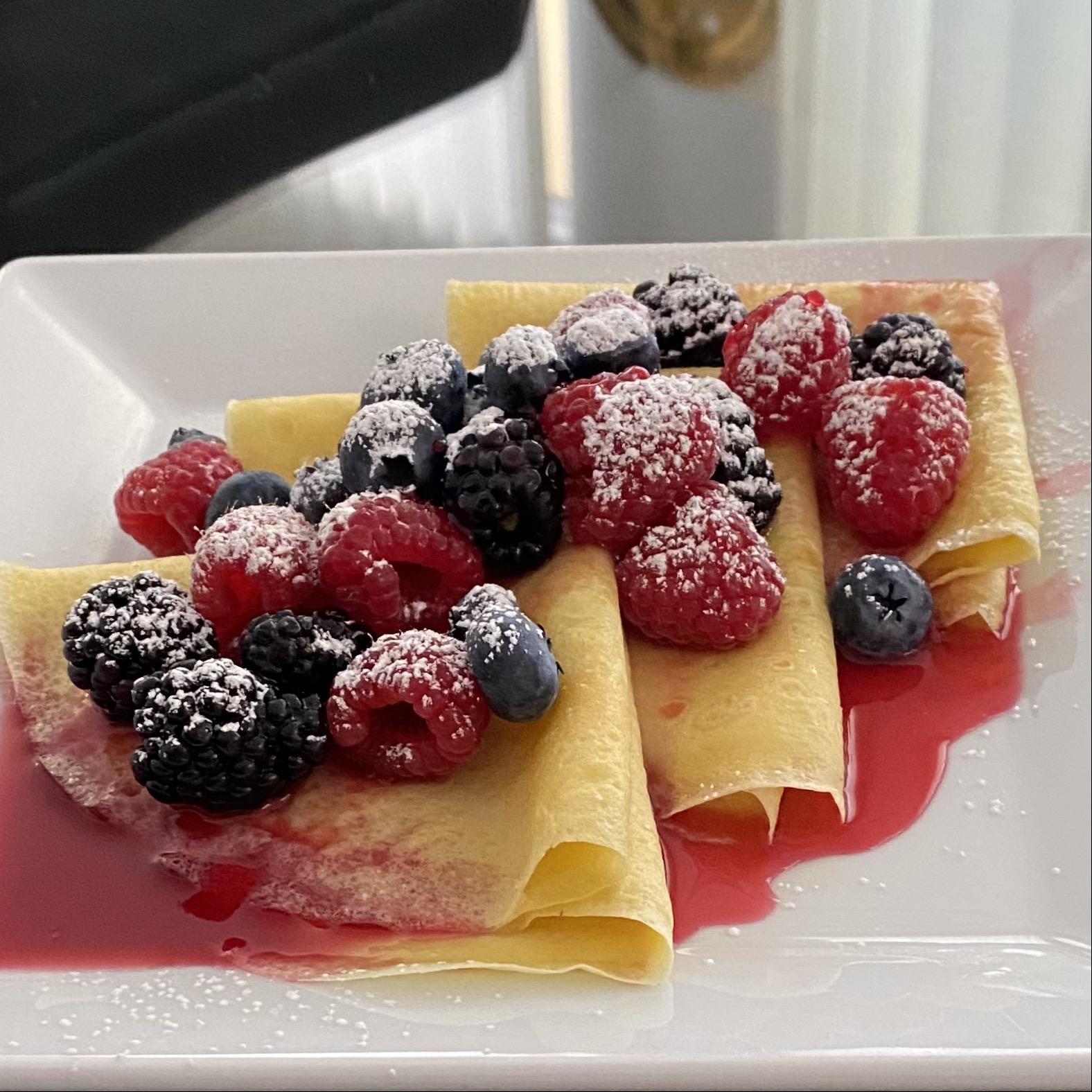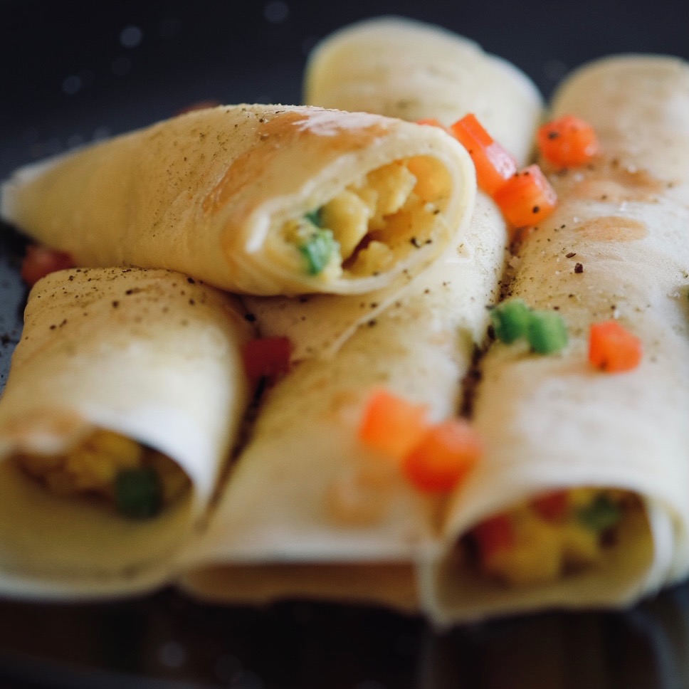 To build the dish shown above, I started with a single crepe. I layered a couple of slices of thin-sliced Hillshire Farms Black Forest Ham. Then I prepared an omelette, dressed it with a couple of ‘lines’ of herbed cream cheese (from a piping bag), rolled it, placed it on the ham, and rolled it all inside the crepe. I’ll admit to being quite proud of how it turned out – it tastes as good as it looks.