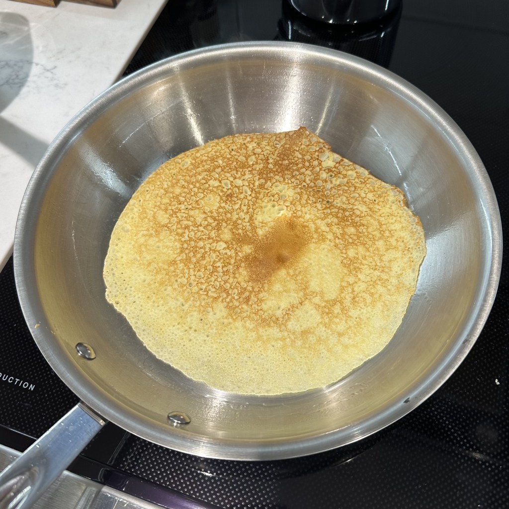 I’ve added a crepe recipe to my library, and as you can see, they cook up nicely in stainless steel. The recipe calls for sugar, which is optional, as if you’re looking for a savory profile, you probably don’t want the sweetness. That’s what I went for this time around.