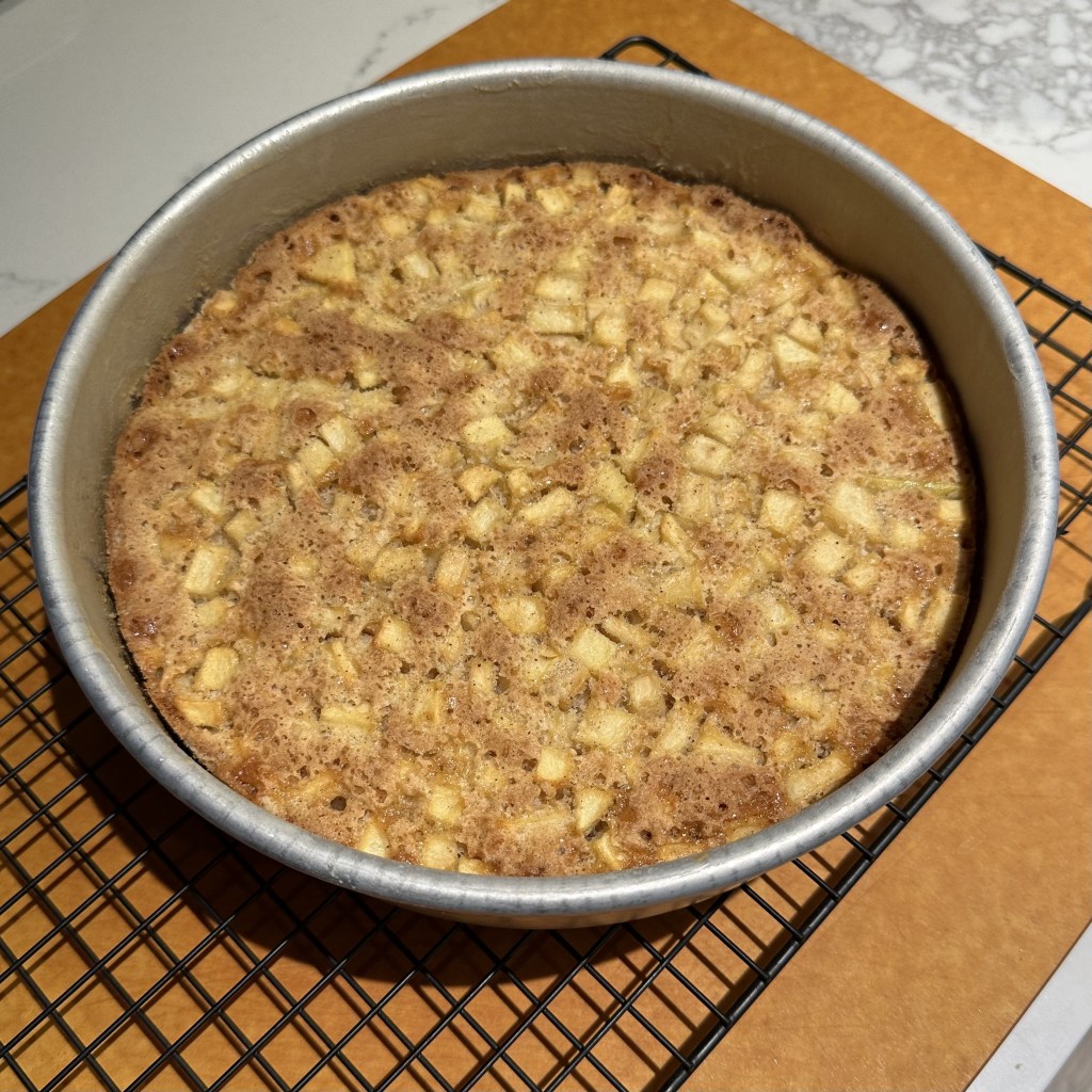 Right out of the oven, the top of the cake unashamedly says “apple”, as you can see from the photo. If this is the look you want, turn it out of the pan, then flip it back over to emphasize the apple.