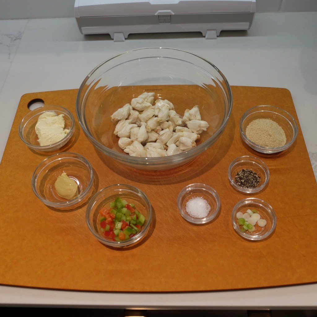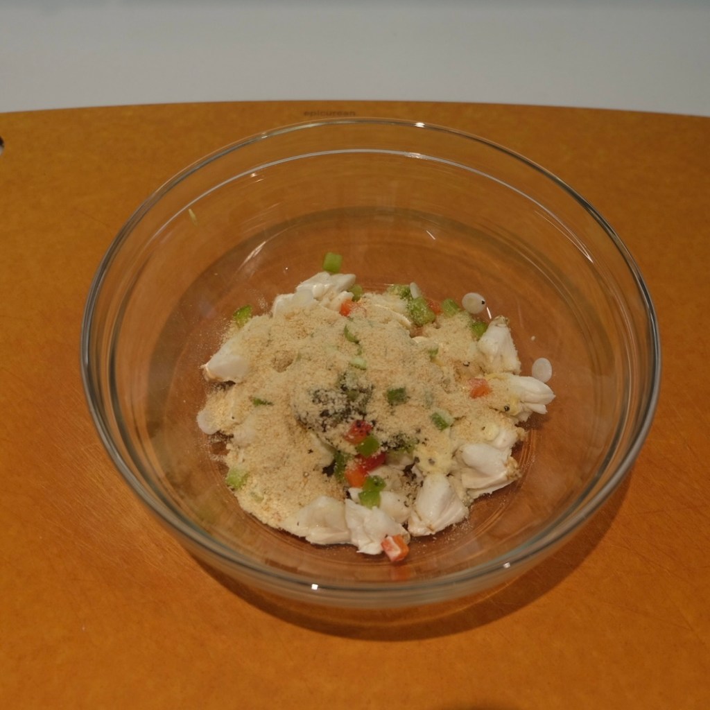 Start with some lump crab (see NOTES), usually around 4 oz per serving. To keep it simple, and to let the crab be the star of the show, you’ll need some mayonnaise, Dijon mustard, diced bell peppers, thinly sliced scallions (green onions), salt, pepper, and some Panko bread crumbs. I don’t go any spicier than this.