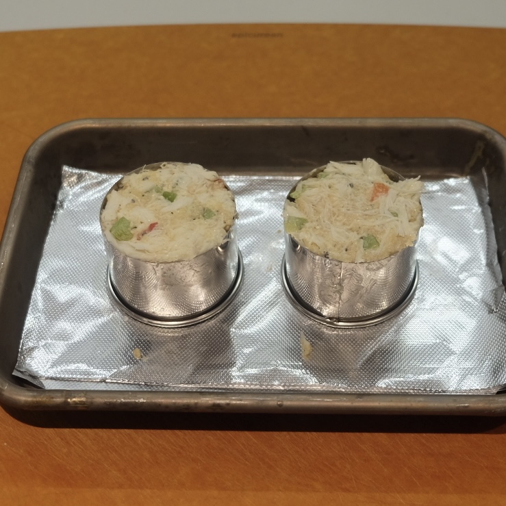 I like to place the crab into 2-1/2″ biscuit cutters. Not only does it look better, it also helps with portion control. Just a hint: if you choose to do this, spray the insides of the cutters with some non-stick spray before you put the crab in. Makes it easier to plate.