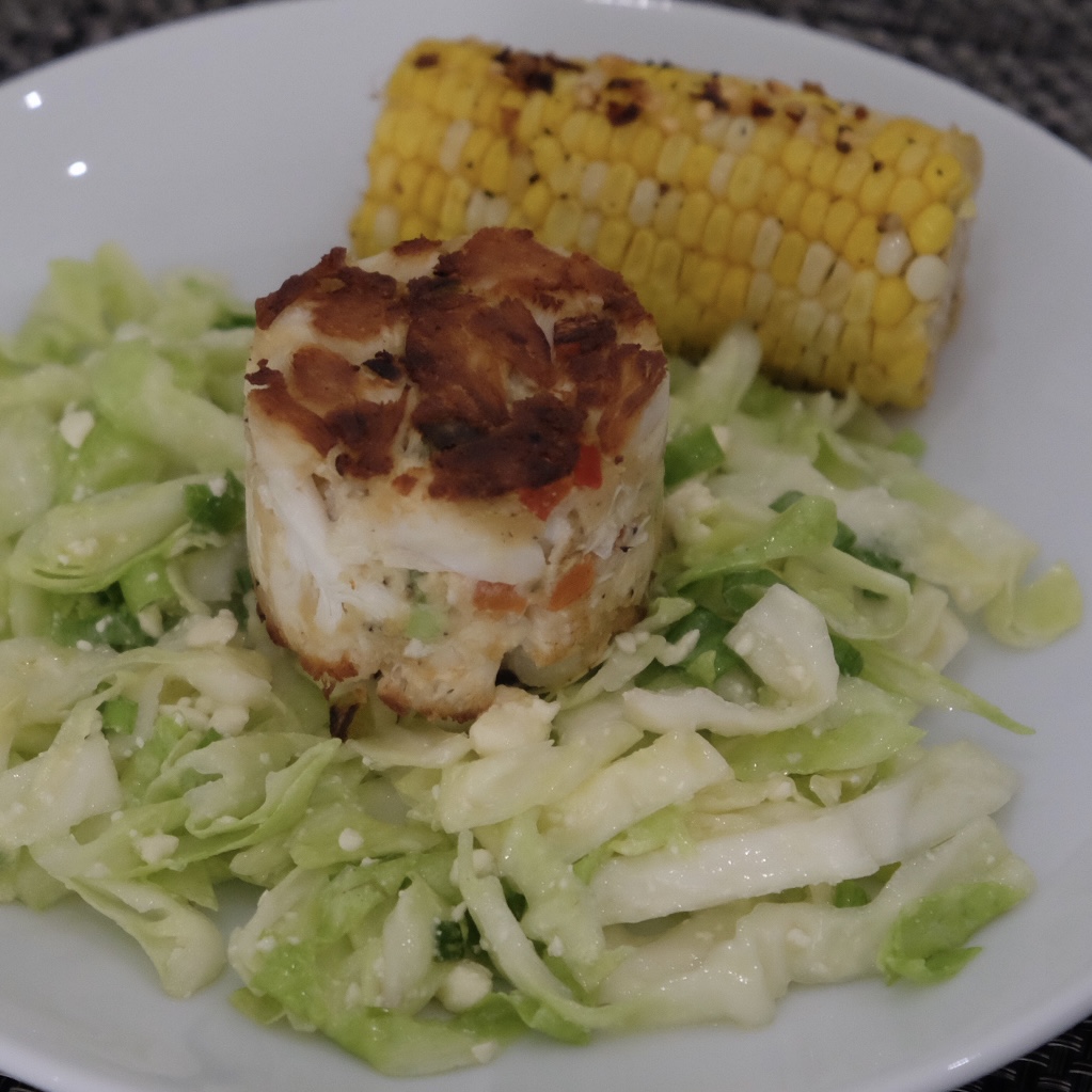 Time-out in the fridge gives you time to get the rest of dinner together. I like a crisp and crunchy Feta slaw, and roasted corn on the cob just shouts seashore dining to me. The corn is easy, too. Butter it, sprinkle with salt and pepper, maybe add some diced bell peppers, wrap it in foil, and roast for 30-35 minutes at 350 deg. If you start the corn when you put the crab cakes in the fridge, your dinner is going to come together beautifully, time-wise.