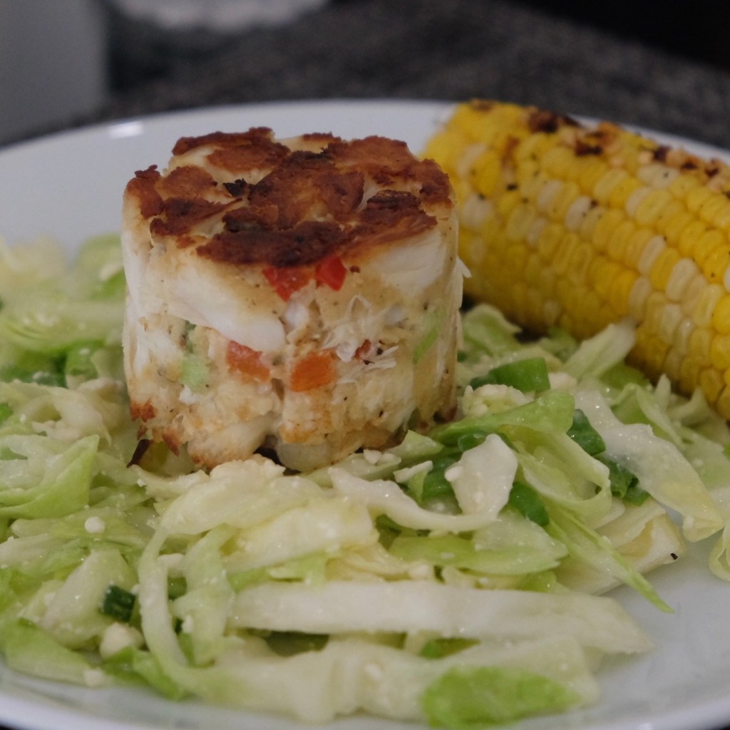 Place the crab cake on the bed of slaw, add the corn on the cob to the side, think sand, surf, blue waters, and a glorious sunset, and you’re ready to go!