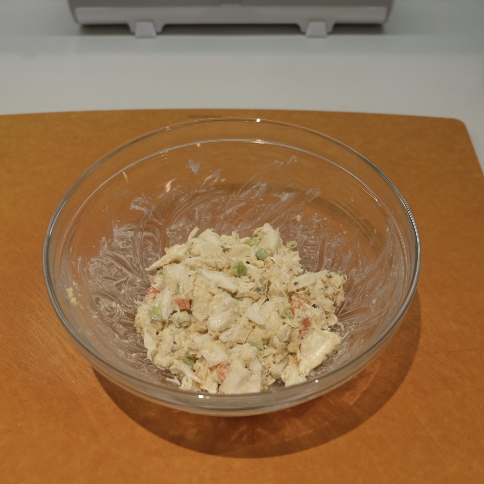 Gently toss it all together. The mayonnaise and mustard, along with the bread crumbs, are going to bind it all together, so you want the crab well coated. However, for the sake of presentation of those beautiful lumps of crab, I emphasize ‘gently’. You don’t want to smush it all up.