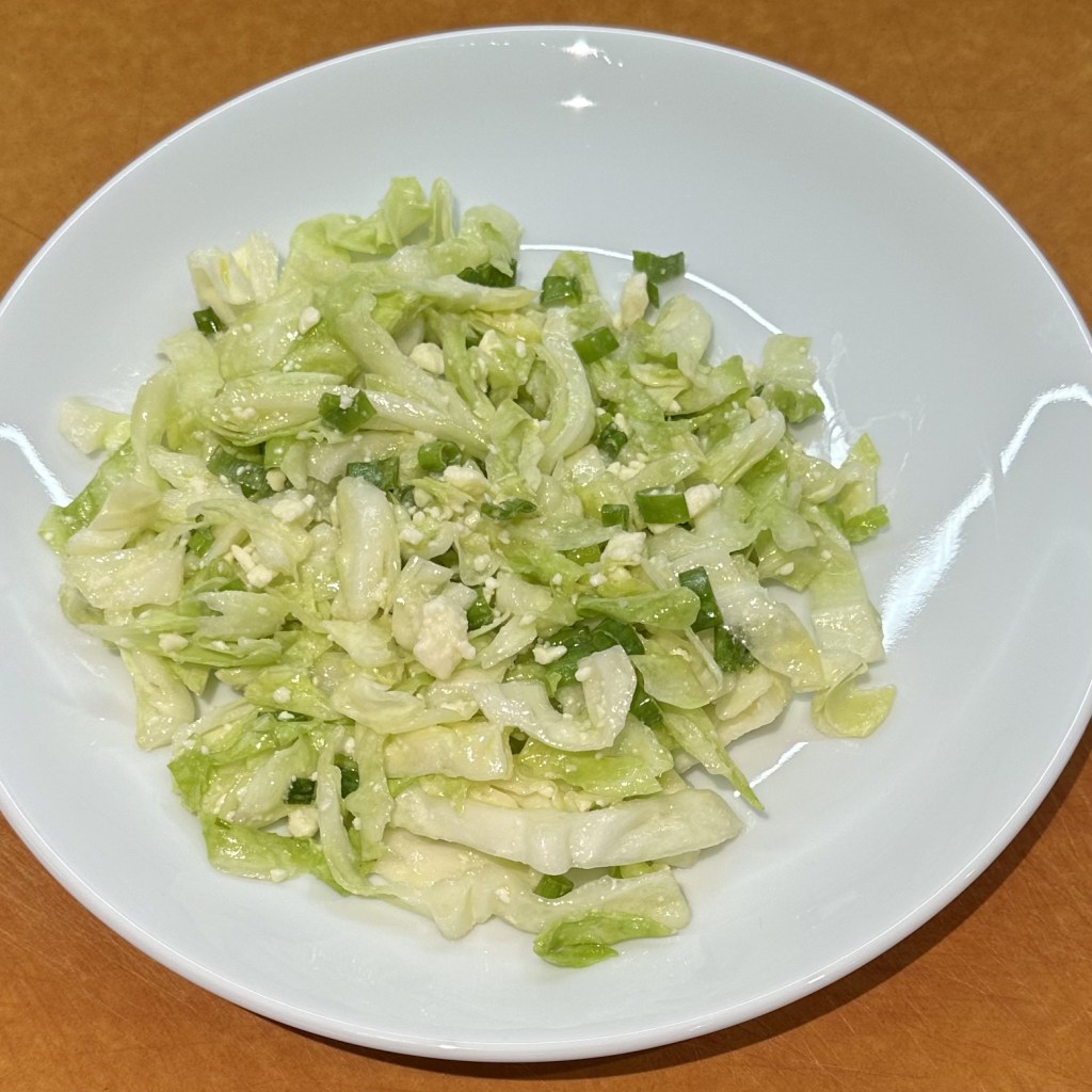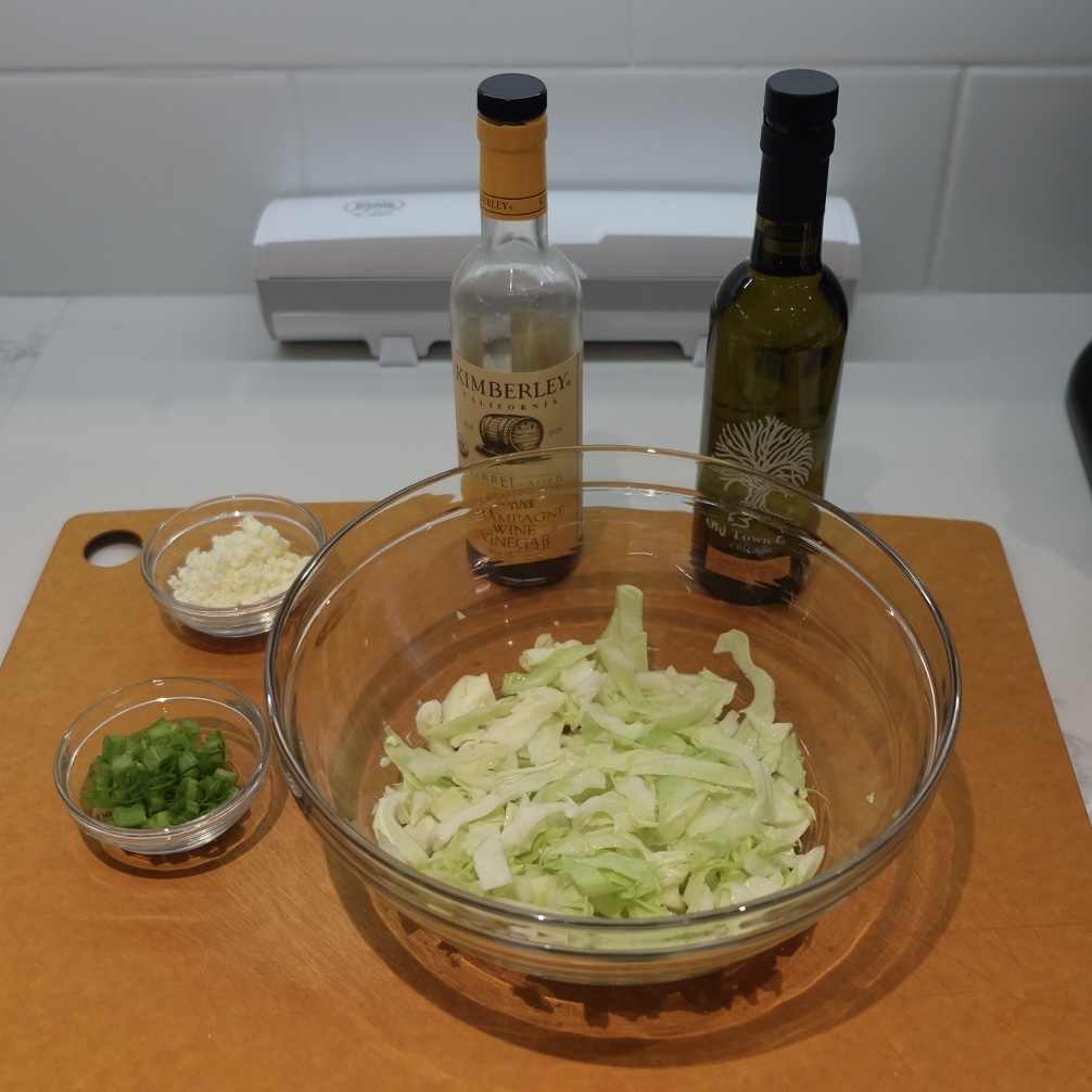When you’re ready (and your corn is still roasting), you’ll need the cabbage, some olive oil, some champagne vinegar, some Feta, and the green part of some scallions. Drizzle oil and vinegar over the cabbage, add the Feta and scallions, and toss it all together.