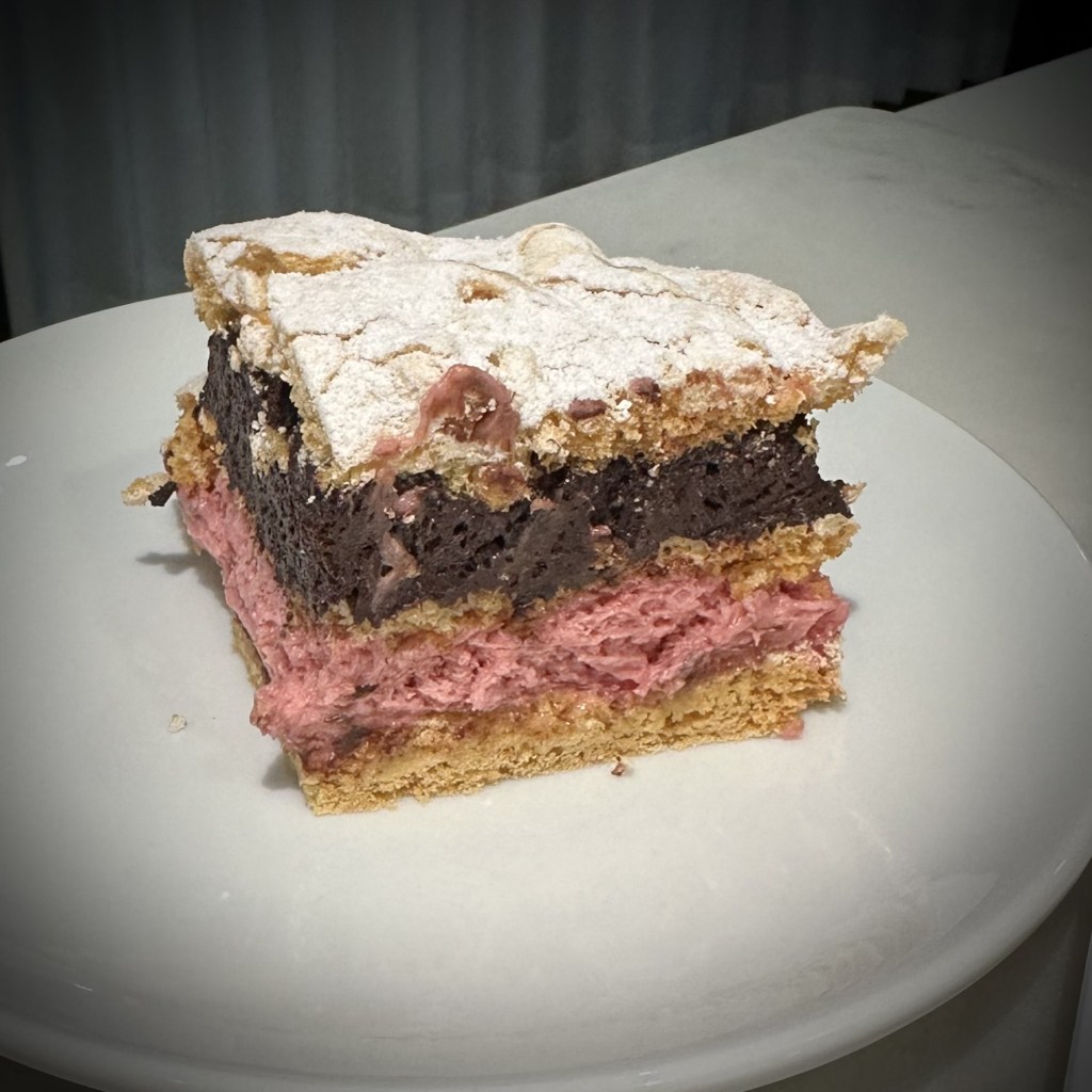 I’d been meaning to try this ever since I first ‘discovered’ it in a cooking boot camp in 2018. I won’t wait so long next time. I separated the layers of dacquoise with raspberry and chocolate Chantilly Creams.