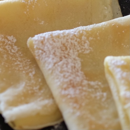 Once again, here’s the traditional. This recipe is from Max Hull, who was a chef instructor for a culinary boot camp I attended. This recipe requires a kitchen scale to make it easy (one bowl), but what I like best about it is the visual guide as to when your pancake is ready to flip. It’s worked every time for me. And, since it’s his grandmother’s recipe, it calls for salted butter on top! Yummy!!!