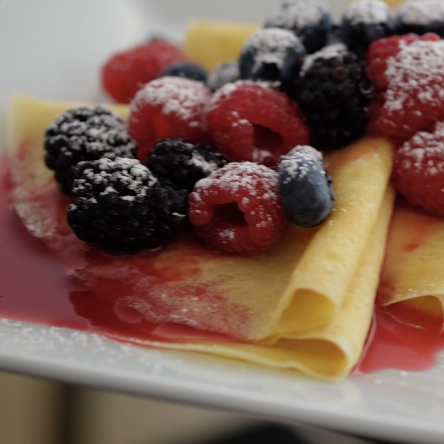 Here we have the pancakes folded in half, twice. They’re topped with some sweetened whipped cream and a mixed berry compote. Compote is just berries, some lemon juice, and sugar. Heat it up, and as the suger pulls out the berry juices, mush them up as you like. It can be served hot or room temperature.