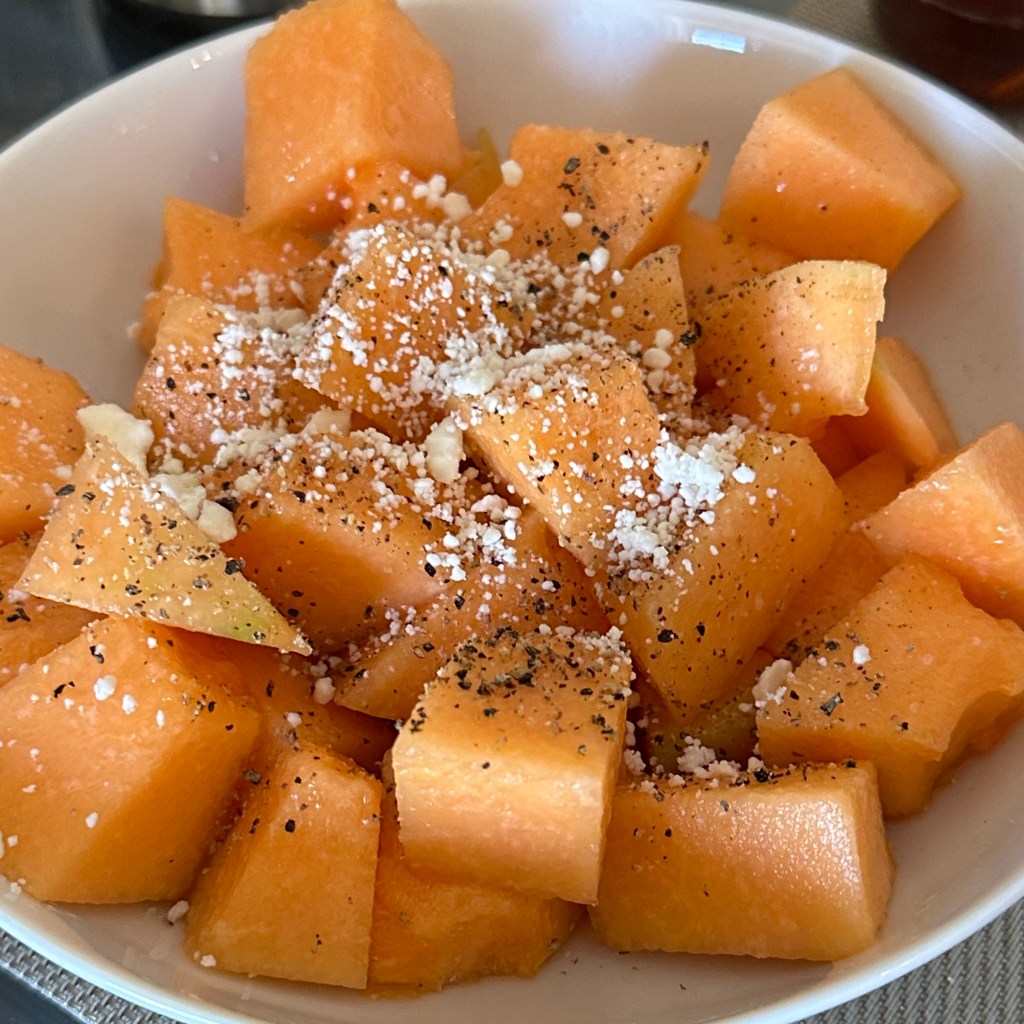 There are lots of ways to enjoy cantaloupe. I just diced it, then just put some salt and pepper on it, and dusted it with a bit of Feta cheese.