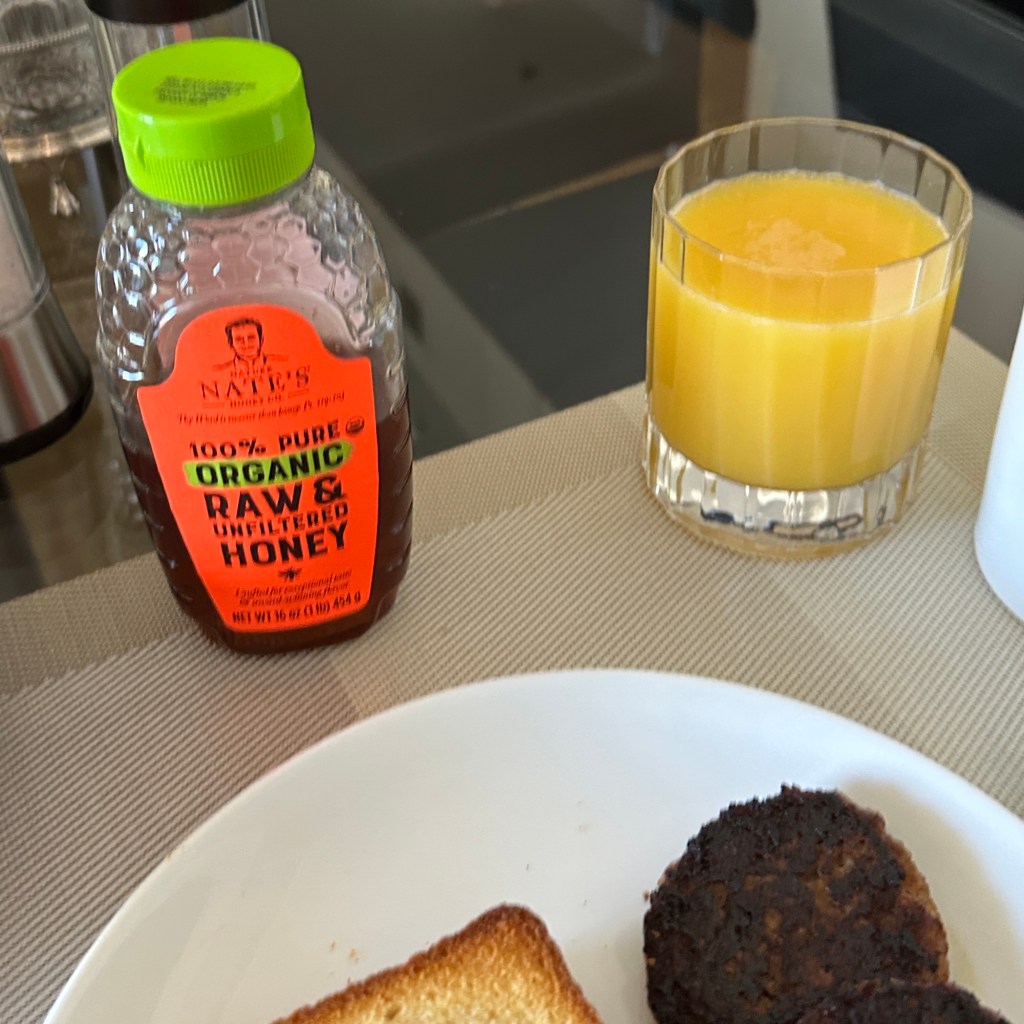 Texas Toast, especially well buttered, is a great vehicle for Nate’s Honey. And starting your day with a glass of TexSun orange juice is a sure winner.
