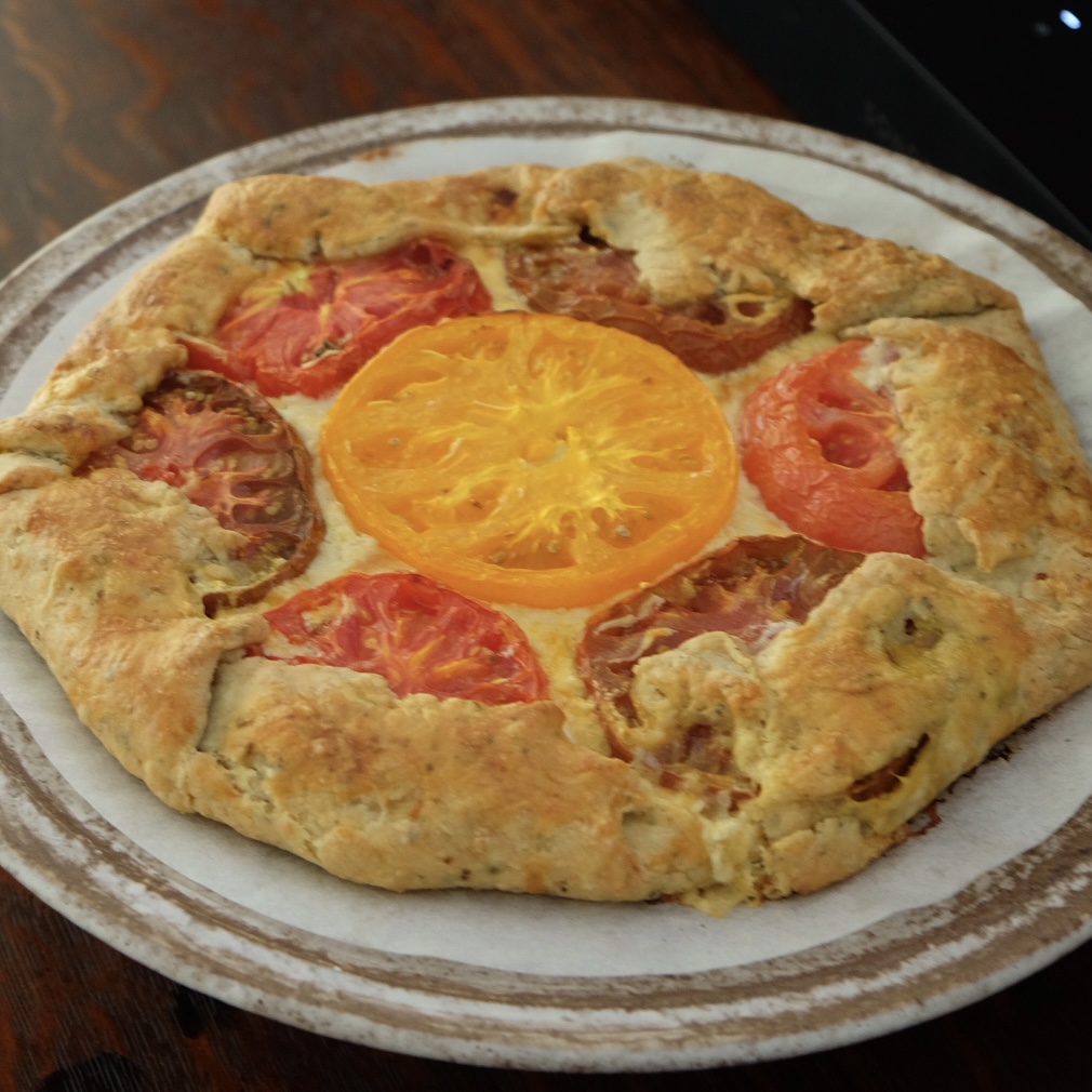 On a lightly floured surface, roll the pastry dough into a 14-inch circle. Spread the cream cheese filling on the rolled-out dough, leaving a 2-inch border around the edge. (see NOTES) Sprinkle on the basil leaves. Pat the tomatoes with the paper towels to remove any excess liquid. Lay slices of tomato on top of the cream cheese filling, reserving the 2-inch border. The tomatoes can overlap slightly but should be in a single layer. Fold the edges of the dough, making 6-8 creases. For a shiny crust, whisk one egg with 2 tsp water and brush over the dough.