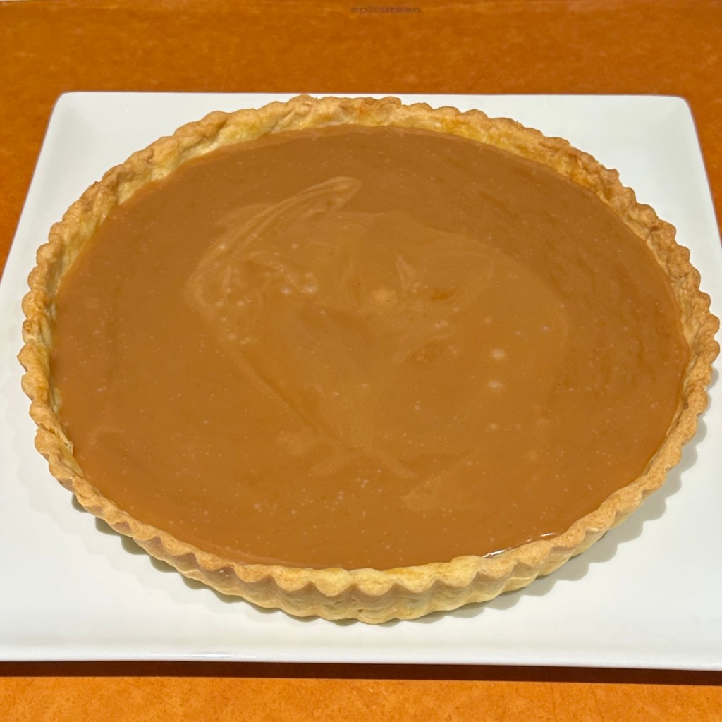 Pour the just warm caramel into the baked pastry case and place it in the fridge, until set. You can leave it in the fridge until you are ready to finish.