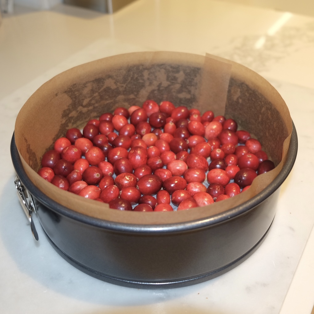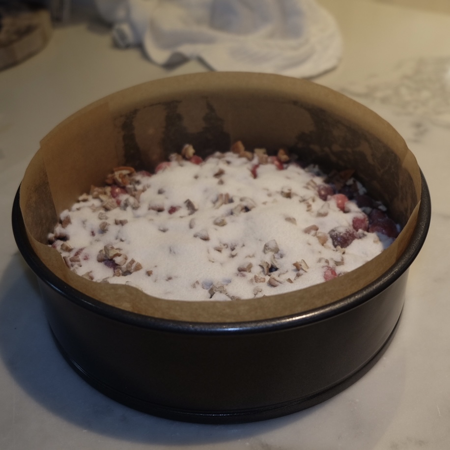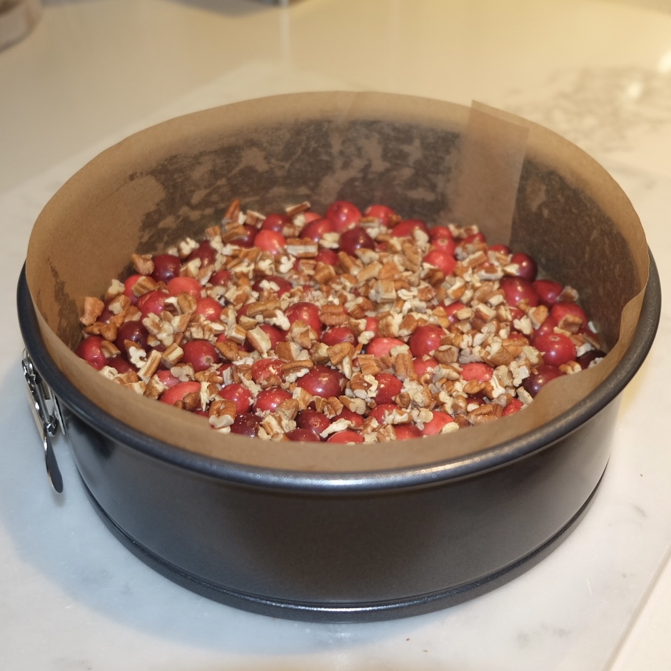 Slowly pour the batter over the top of the cranberries and pecans in large ribbons in order to evenly cover the surface. Spread gently if necessary. (see NOTES)