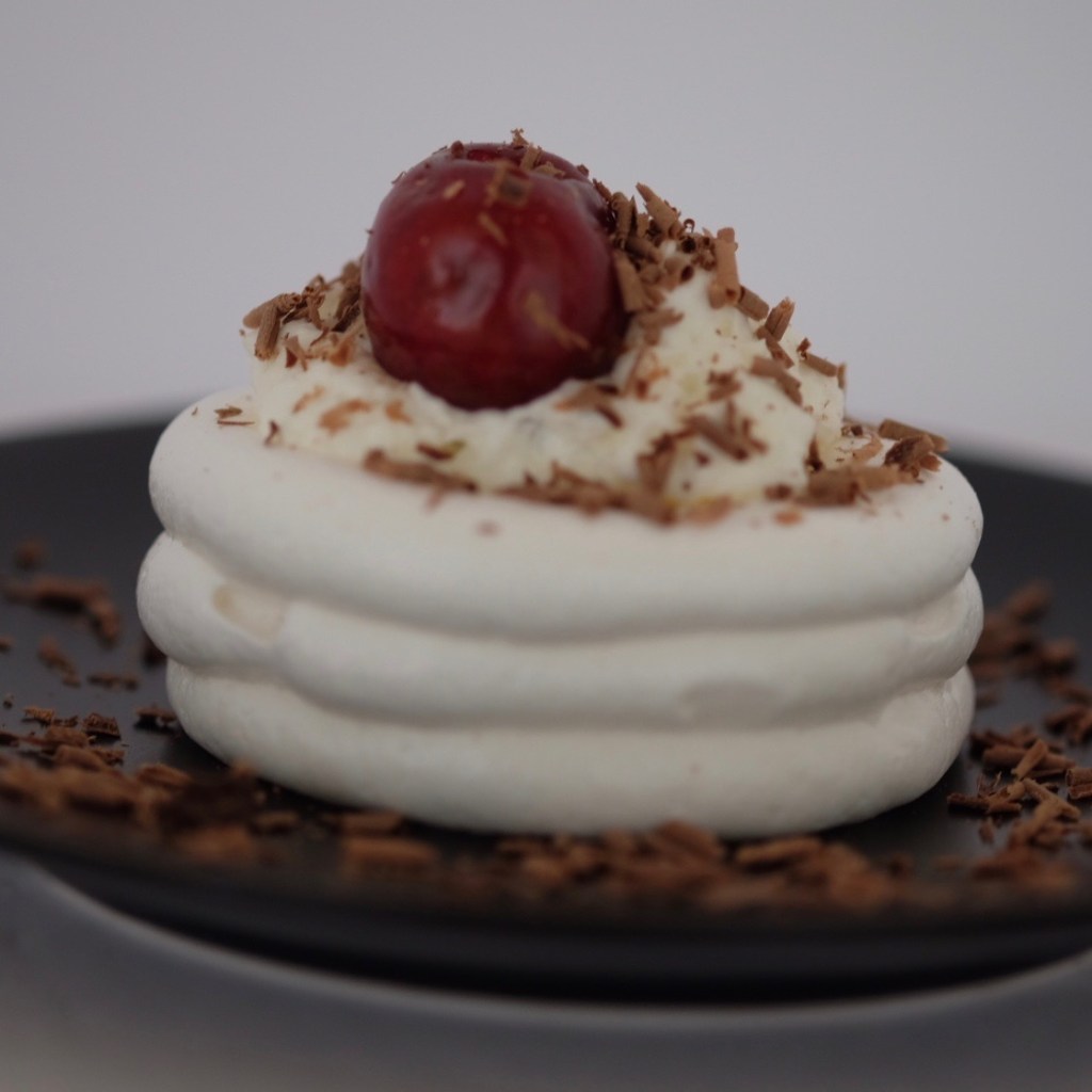 A smaller, closer to bite-sized version of the Pavlova just above, this was created by piping the meringue into a cup. the cup was filled with whipped cream, topped with a single pitted fresh cherry, and dressed with shaved bittersweet chocolate.