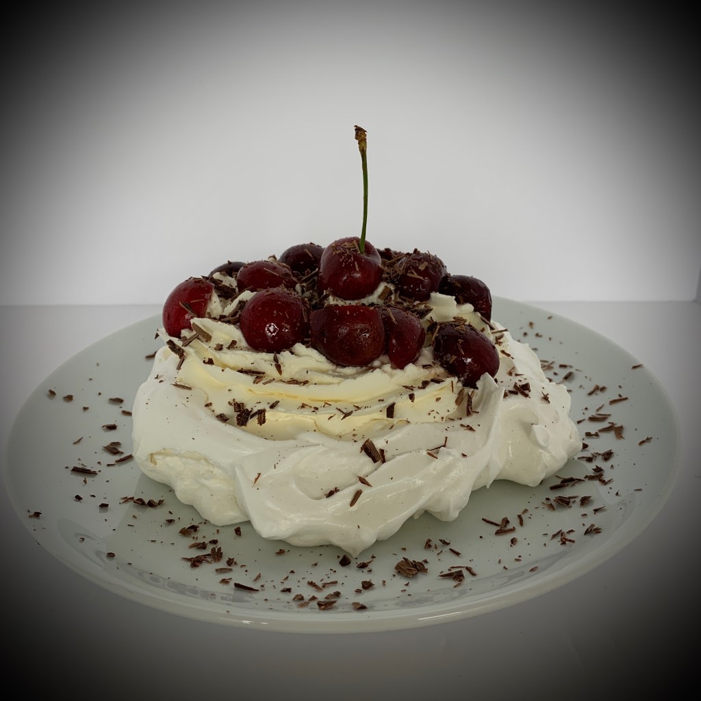 When fresh cherries were in season (and you could use frozen other times), this smaller Pavlova – serving for two, perhaps – was made using fresh, pitted cherries and shaved bittersweet chocolate.