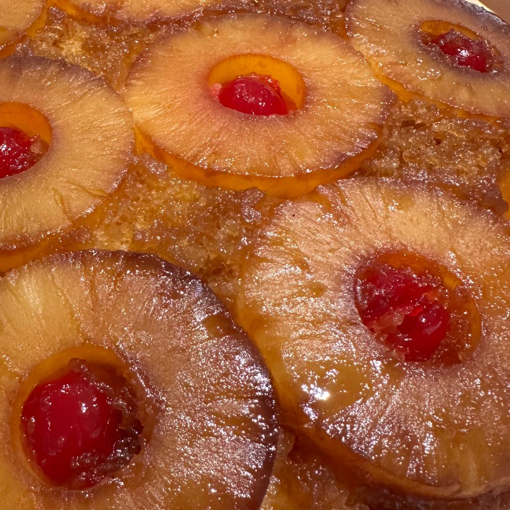Once baked, remove from the oven, let it rest for just a few minutes (for sure no more than 10), then invert it onto your serving platter. If a pineapple slice sticks to the pan, remove it and place it where it belongs. Spoon any butter/brown sugar mixture remaining in the pan over the cake.