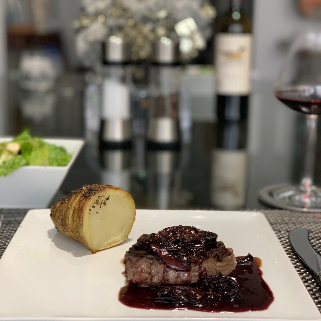 One evening at The Ambassador Hotel in Chicago, craving some red meat, I ordered their filet mignon. It came very simply presented, sitting in a rich, Port wine reduction. Delicious, and one of those things I just had to try to recreate. The color alone is worth the time and effort to make the sauce. Pour it over, or set your filet in an artfully placed puddle. You’ll think twice about going to a steak house, again. And, once you get the ingredients down, and maybe adjusted to your taste, you’re set to make as much or as little as you like.