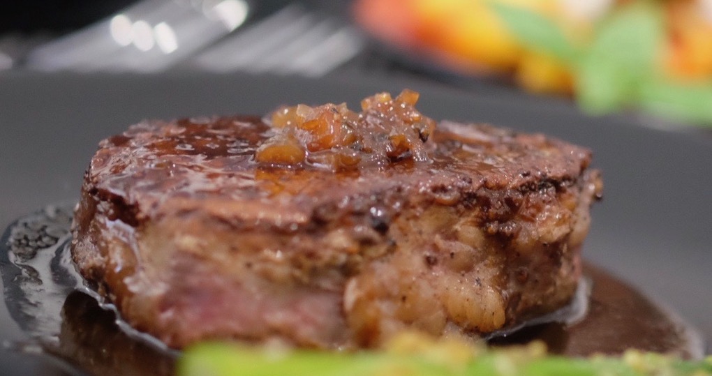 Here’s a more formal presentation. The sauce is thick enough that it stays close by for dipping each bite of filet. You can see, again, the shallot on top. Bon appetit!