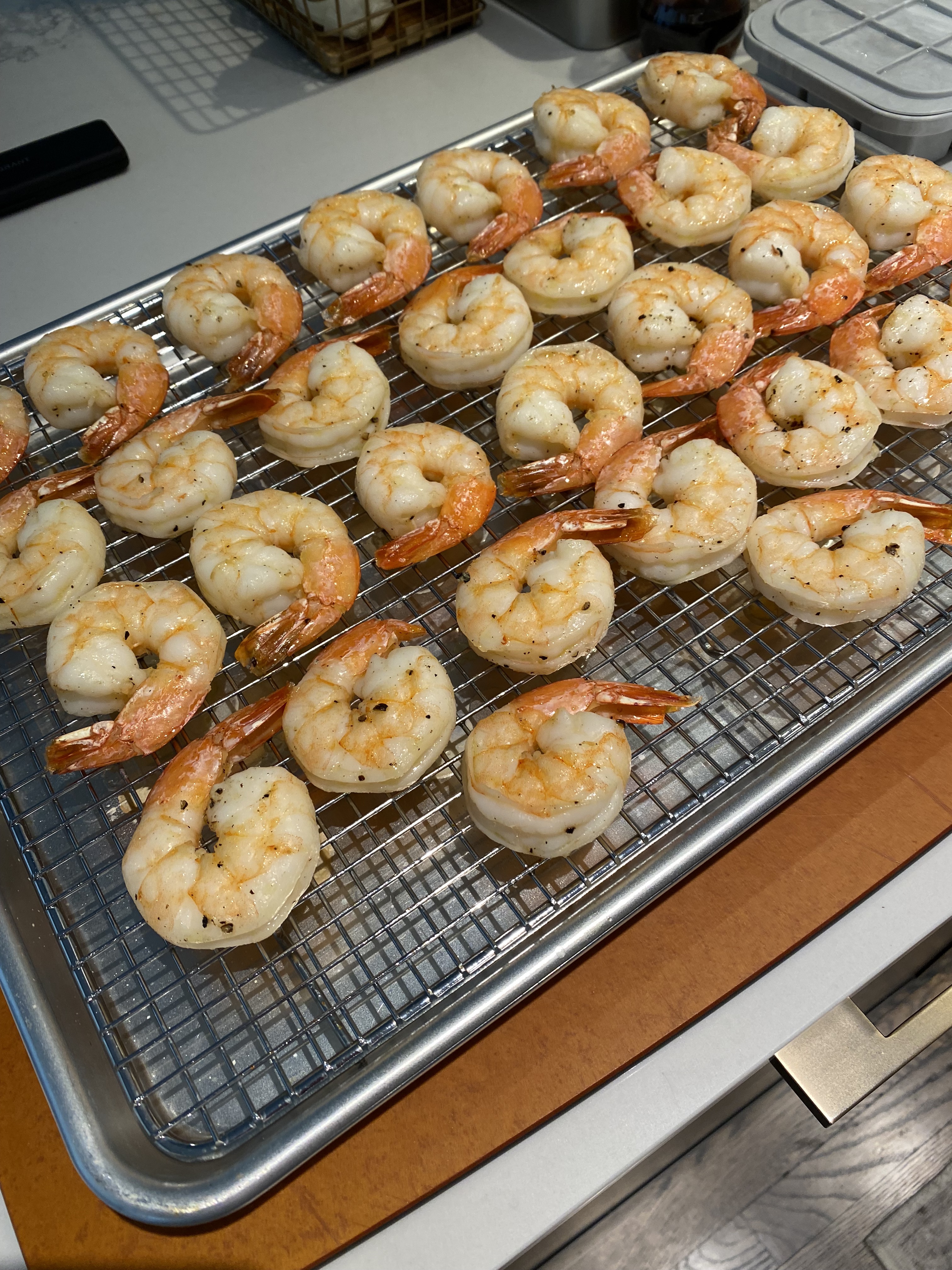 If you have an oven-safe cooling or grilling rack, placing that in the baking sheet, and the shrimp on top, will tend to make the roasted shrimp a little drier. You’ll want to let the shrimp air-dry a little, especially if you’re going to vac-seal some for your freezer for later use.