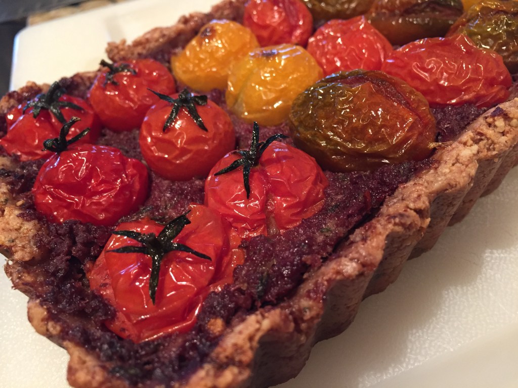 Remove tart from oven, spread in the tapenade, and cover the top with whole cherry tomatoes. Brush tops of the tomatoes with olive oil. Place the tart in the oven to bake for 30 to 40 minutes, until crust in golden and the tomatoes are slightly blistered. Let cool in tart pan.